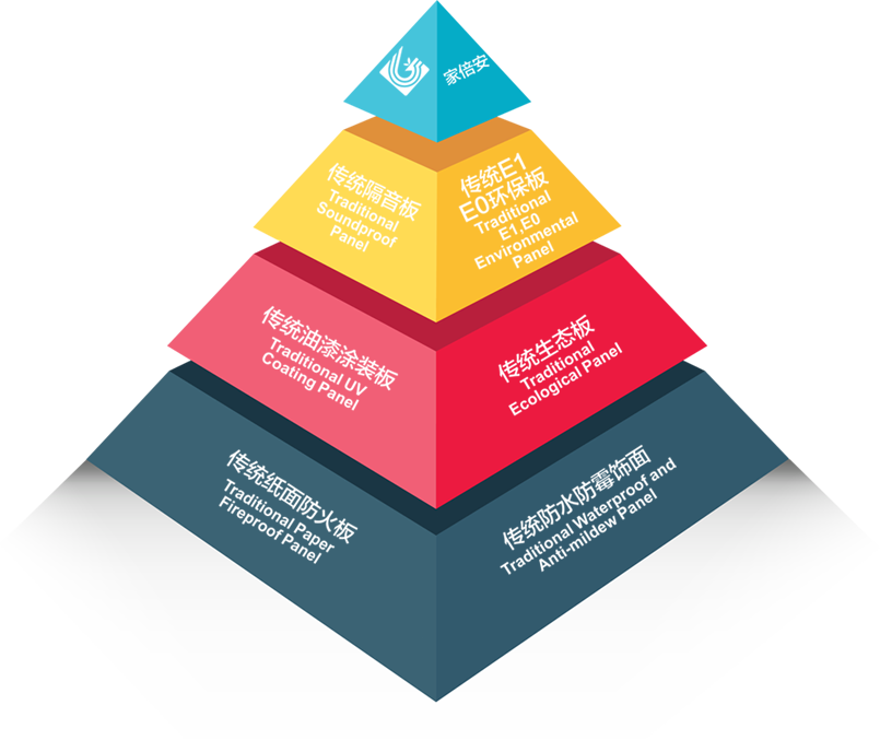 • “家倍安”使用高阻隔金屬鋁箔和高滲、超耐磨納米材料,經過高溫高壓獨特的工藝方法處理,飾面木質纖維結構更加縝密,隔音、降噪,導熱系數低,防火等級高,達到國家防火材料防火標準A2級。